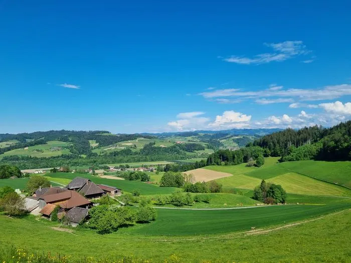 Hier und da erblicken Sie traditionelle Emmentaler Bauernhöfe, die das Landschaftsbild seit Jahrhunderten prägen. Mit etwas Glück begegnen Sie sogar einem freundlich grüssenden Bauern auf dem Traktor oder halten am Gartenzaun einen Schwatz mit der Bäuerin.