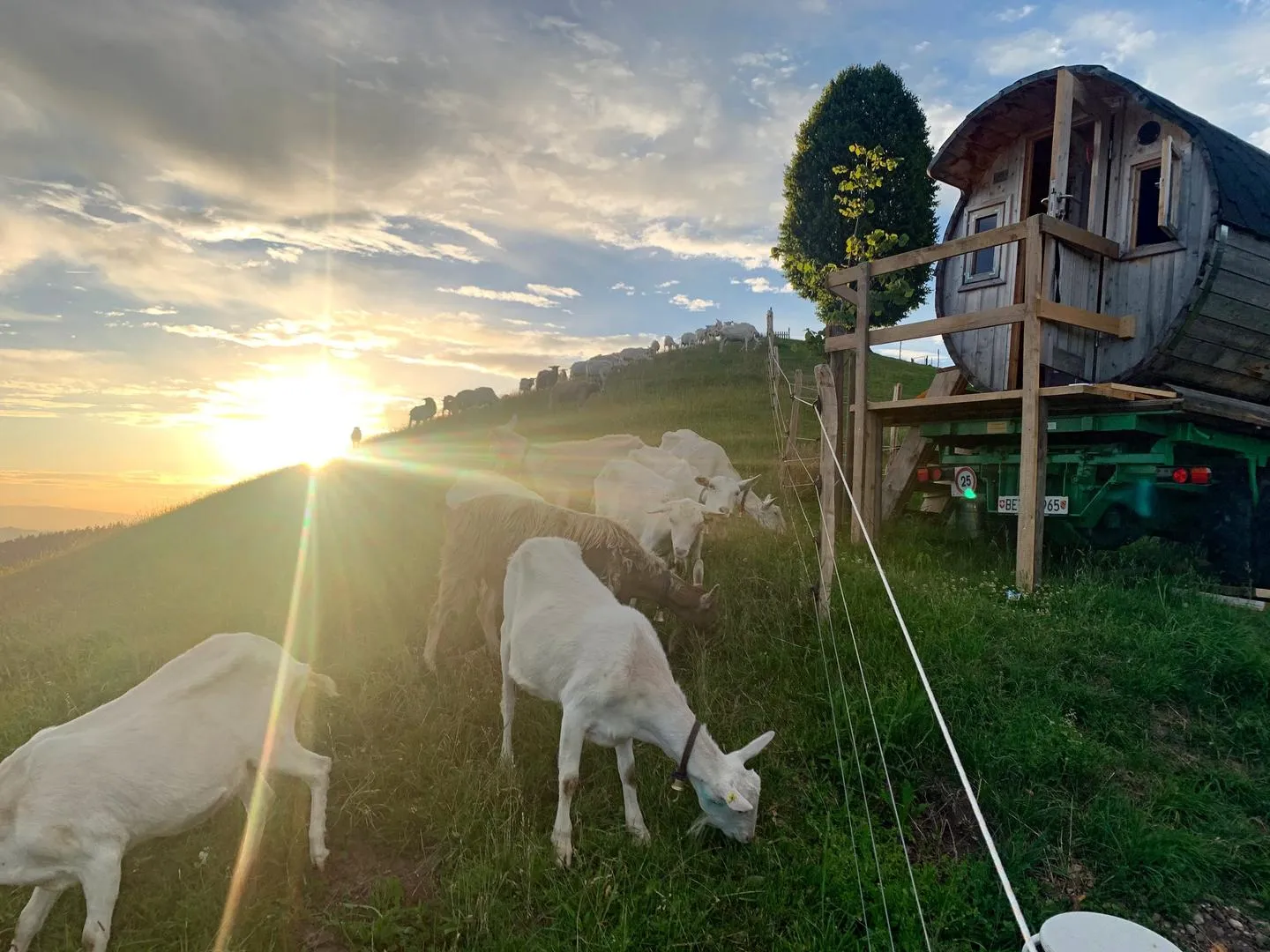 Oben mit dem Gravelbike angekommen steht das Panorama-Fass mit einem Doppelbett für 2 Personen. Das Fass ist oberhalb des Bauernhofes auf einer Weide platziert (ca. 150 Meter vom Bauernhof) und zu Fuss erreichbar. Was gibt es Herrlicheres, als bei Glockengebimmel einzuschlafen? Erleben Sie zu zweit den Sonnenuntergang mit Weitsicht.Ein WC sowie eine einfache Dusche (zur alleinigen Benutzung) ist auf dem Bauernhof vorhanden. Ein Campingkocher (mit 2 Platten), Campinggeschirr, ein Kugel-Grill sowie ein Tisch und 2 Stühle sind mit dabei. Ein Kühlschrank mit Gefrierfach (zur alleinigen Benutzung) steht auf dem Hof bereit. Bett- und Frotteewäsche, wie auch die Endreinigung sind im Preis enthalten. Im Innern des Fasses hat es nebst dem Doppelbett eine ausziehbare Tischplatte und zwei Sitzbänke an der Wand. Täglich frisches Quellwasser wird in einer Milchkanne bereitgestellt und runden das Angebot ab.